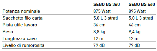 Il nuovo battitappeto SEBO BS 360 / 460 continua la lunga tradizione di successo dei due motori. Collaudate caratteristiche come l’elettro spazzola comfort, il pratico tubo aspirazione manuale telescopico unito al perfezionato sistema filtrante lo rendono conforme al secondo grado delle direttive UE sull’emissione di polvere per apparecchi aspirapolvere.Pronto per nuove sfide. Il nuovo battitappeto aspirapolvere SEBO BS 360 / 460 unisce il design alle prestazioni